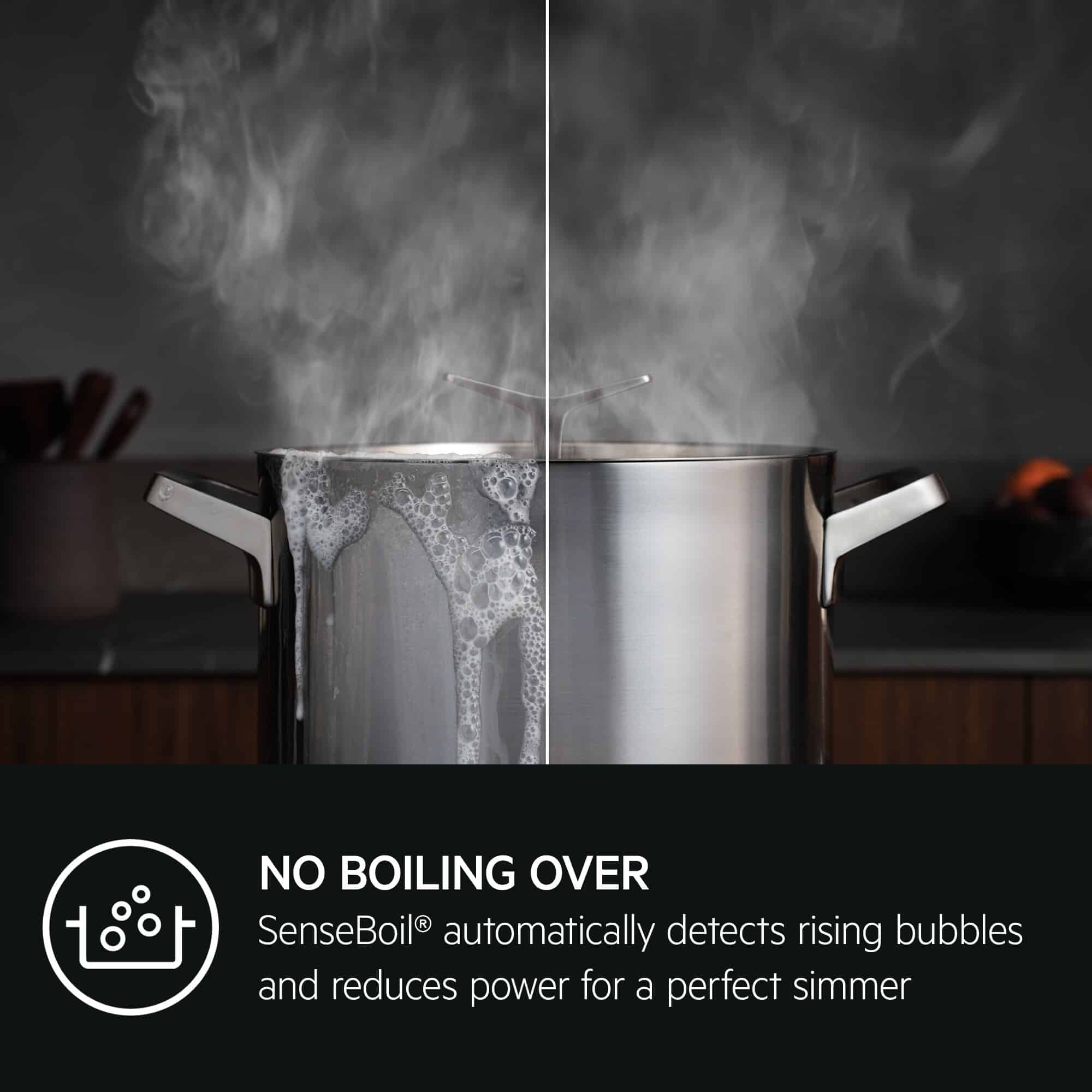 Kogesensoren registrerer bobler og justerer automatisk temperaturen til en kontrolleret simren. Slut med overvågning. Sparer tid og energi.
