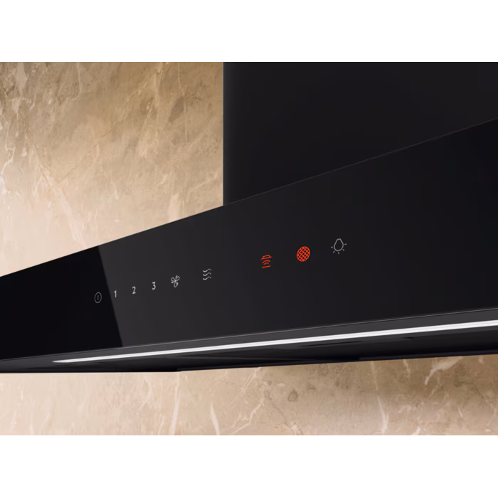 Electrolux LFV439K er en 90 cm skråtstillet emhætte i sort glas med Hob2Hood, op til 615 m³/t udsugning, stille drift, LED-belysning og vaskbare filtre til både aftræk og recirkulation. Læs hele beskrivelsen